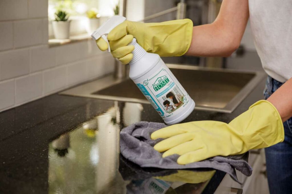 Additionally, using a Healthier Home Product cleaner helps to protect the environment and your family’s health, as it is free from harsh chemicals and other harmful ingredients. To use the cleaner, simply spray it on the surface and wipe it clean with a soft cloth. With regular use, this cleaner can help keep your granite countertops looking their best while also protecting your health and the environment.